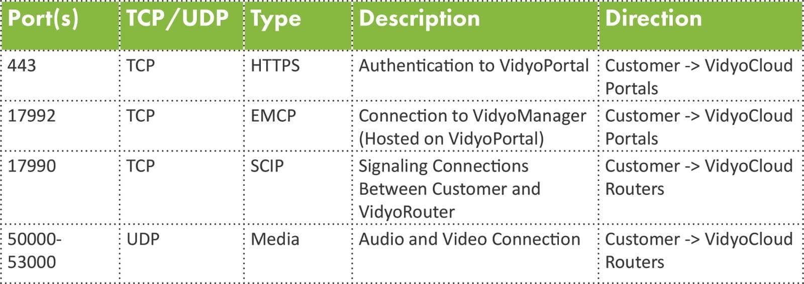 Outbound traffic on the required ports from customers to the VidyoCloud Production subnets: