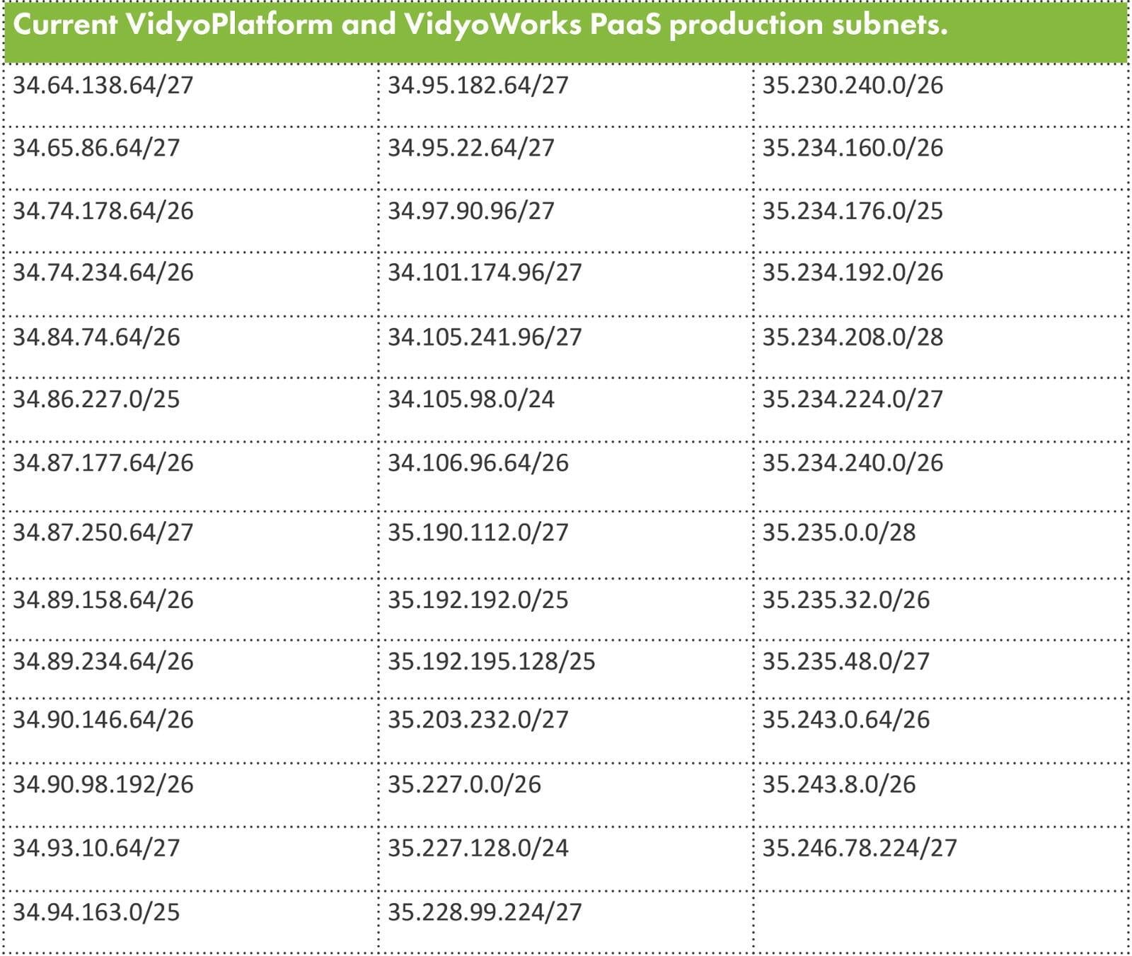 VidyoPlatform (platform.vidyo.io) and VidyoWorks (api.vidyocloud.com) PaaS systems Production Subnets (Current)